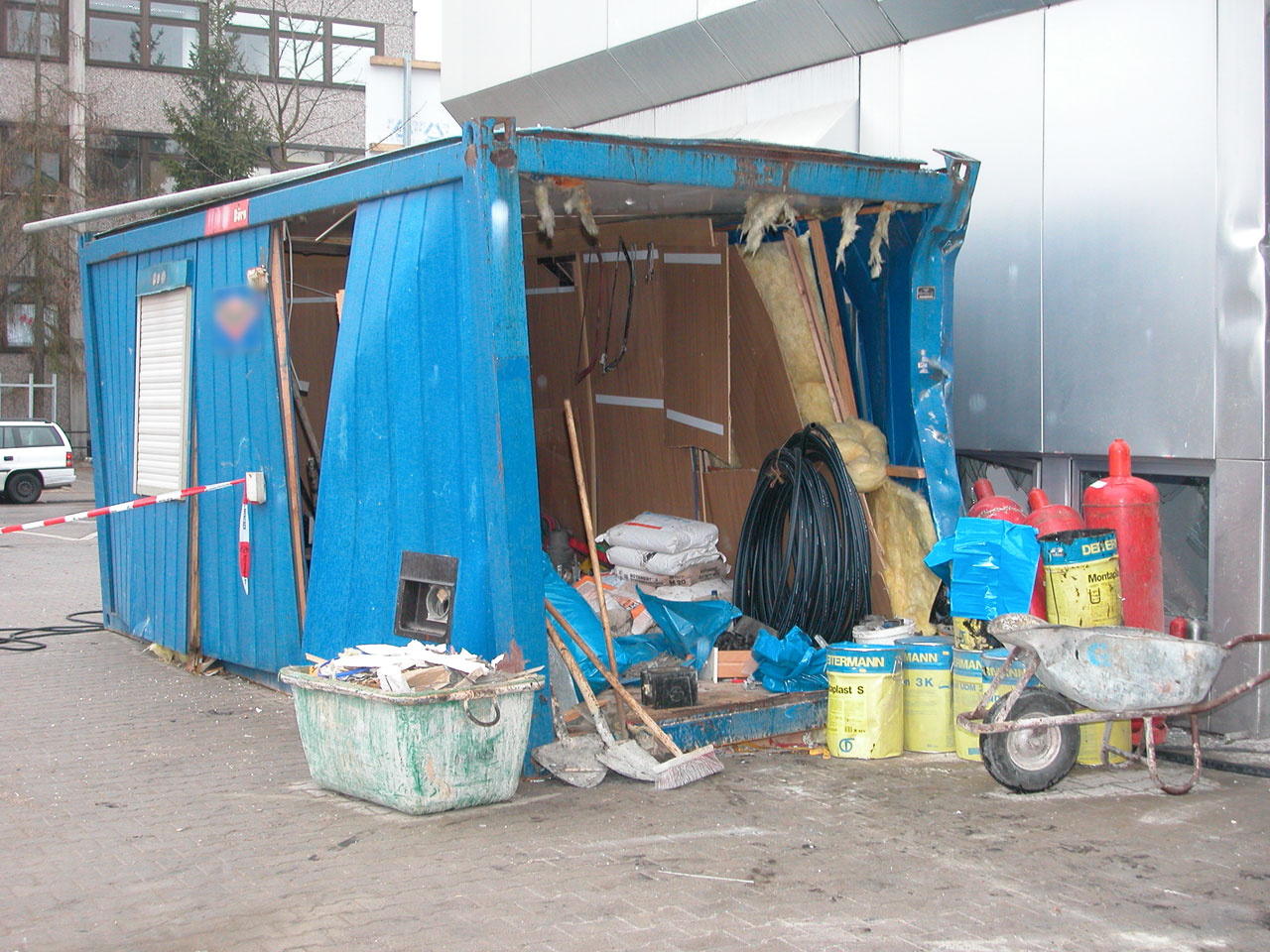 Bauarbeiter hatten eine vermeintlich leere Gasflasche nach der Benutzung nicht wieder zugedreht und in einem Baucontainer abgestellt. Das ausgeströmte Gas entzündete sich Stunden später explosionsartig, als sich die Heizung des Containers einschaltete. Der Container flog in die Luft; seine umherfliegenden Teile richteten großen Schaden in der Umgebung an. Das daneben liegenden Gebäude wurde sowohl außen als auch innen massiv beschädigt- Trockenbauwände wurden verschoben, empfindliche Messinstrumente zerstört und Türen aus den Angeln gerissen. Auf der gegenüberliegenden Straßenseite musste die Feuerwehr rund 15 Fenster verschalen, deren Scheiben zerbrochen waren. Auch wurden dort parkende Autos durch umherfliegende Teile beschädigt.