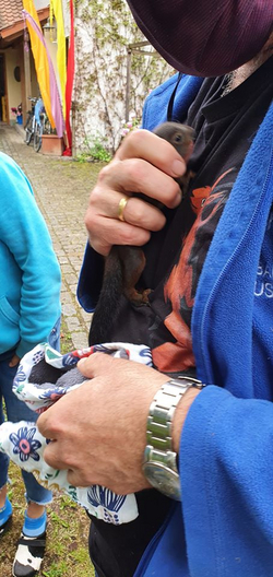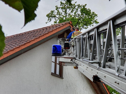 Eine Eichhörnchen Familie hatte sich in den letzten Wochen im Dachüberstand eines Einfamilienhauses einen Kobel eingerichtet. Aus diesem Kobel war am Vortag ein Jungtier gestürzt und einige Meter tiefer auf das Garagendach fallen. Das Jungtier wurde vom Eichhörnchen Schutz e.V. aufgenommen. Da das Muttertier längere Zeit nicht mehr gesehen wurde bestand die Gefahr, dass weitere Jungtiere aus dem Kobel fallen könnten. So übernahmen die mütterliche Fürsorgepflicht ersatzweise die Mitglieder der Feuerwehr Gräfelfing zusammen mit einem Mitarbeiter des Eichhörnchen Schutz e.V. in dem die noch verbliebenen zwei Jungtiere mit der Drehleiter aus dem in ca. 9 Metern Höhe gelegenen Kobel gerettet wurden. Die ca. 6 Wochen alten Jungtiere werden nun untersucht, versorgt und nach einigen Wochen in einem Auswilderungs-Gehege auf das selbstständige Leben in Freiheit vorbereitet.